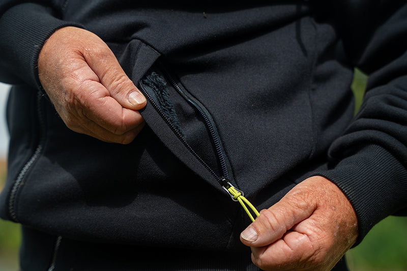 - Buzunare pentru maini cu fermoar, captusite interal cu lana Sherpa
